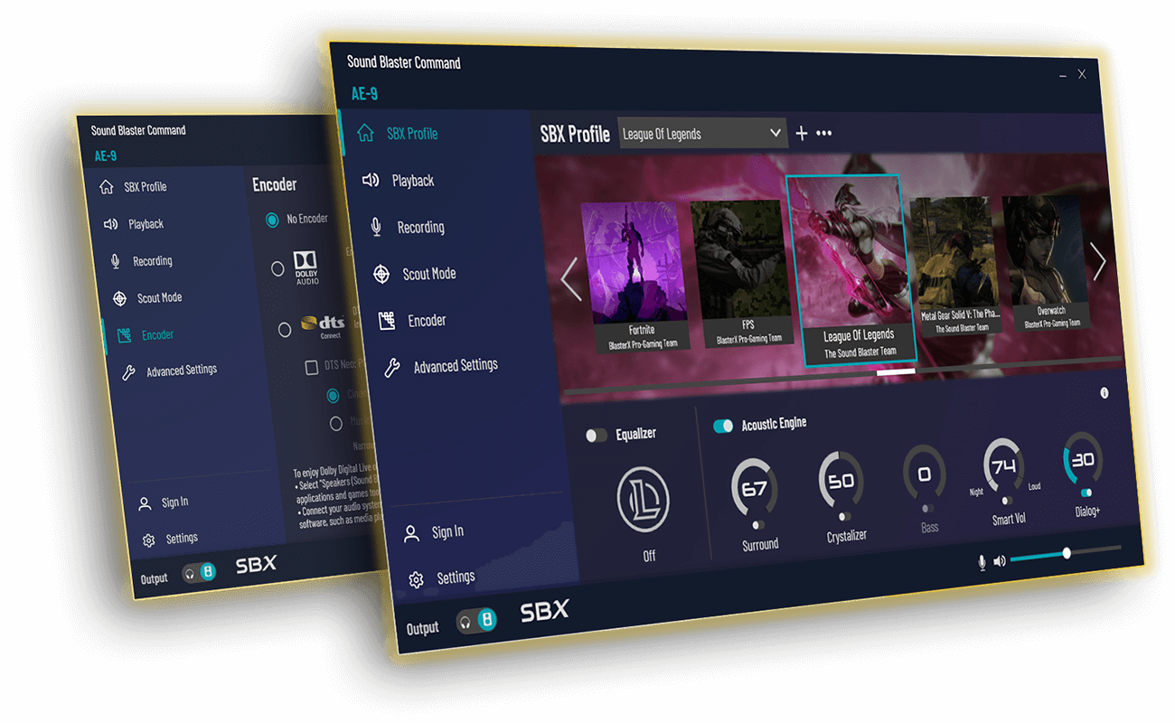 Sound Blaster AE-9还兼备一整套的处理技术 – 如:Sound Blaster的Acoustic Engine、Dolby Digital Live和DTS Connect编码 – 以及便捷而强大的ACM音频控制模块。