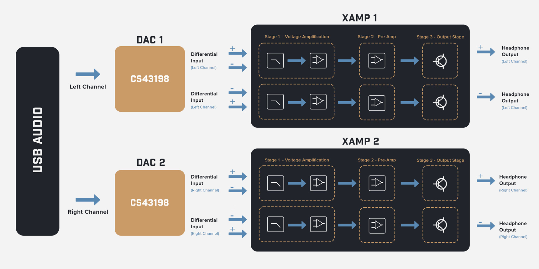 简而言之,此款外部 USB 声卡可在 130 dB DNR 下实现高达 32 位/384 kHz 的 PCM 播放,并具有 Cirrus Logic CS43198 DAC和我们定制设计的全平衡的 Xamp 耳机双放大器以及可定制的DSP均衡器功能。
