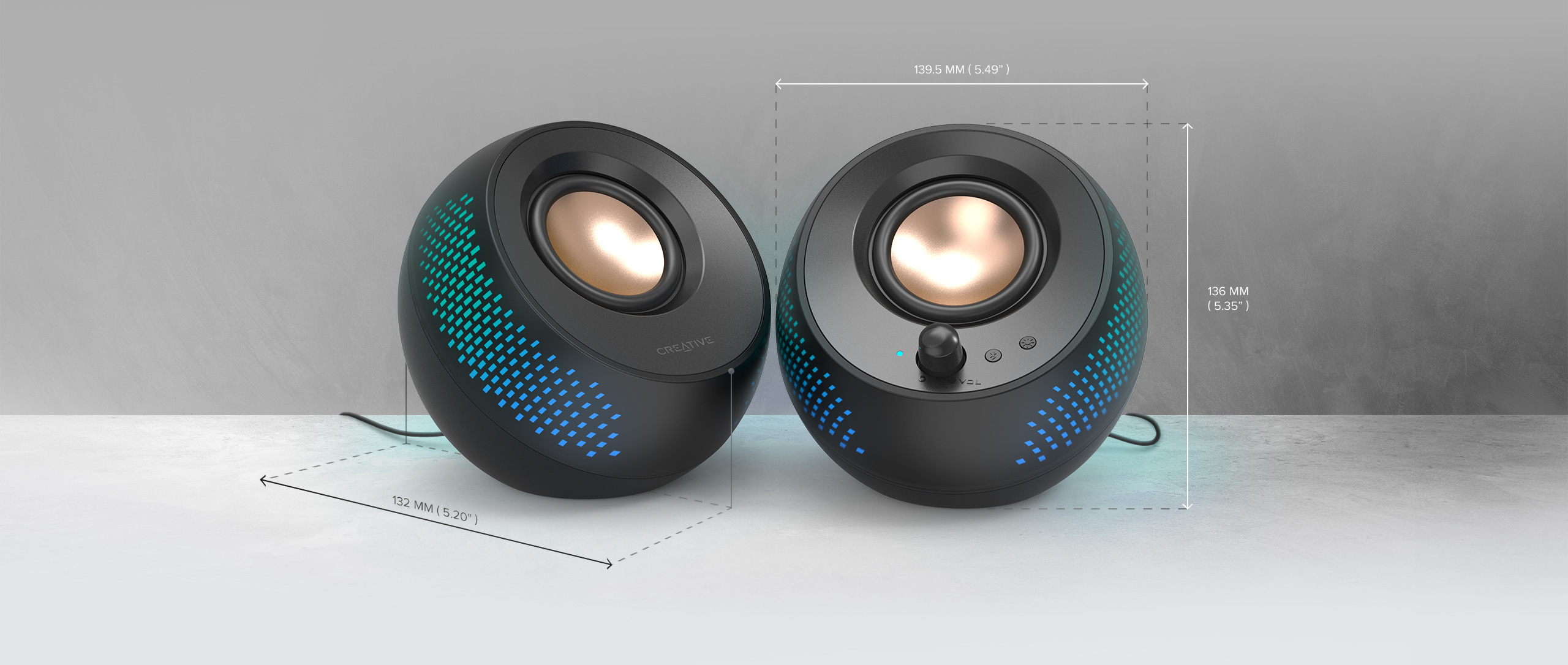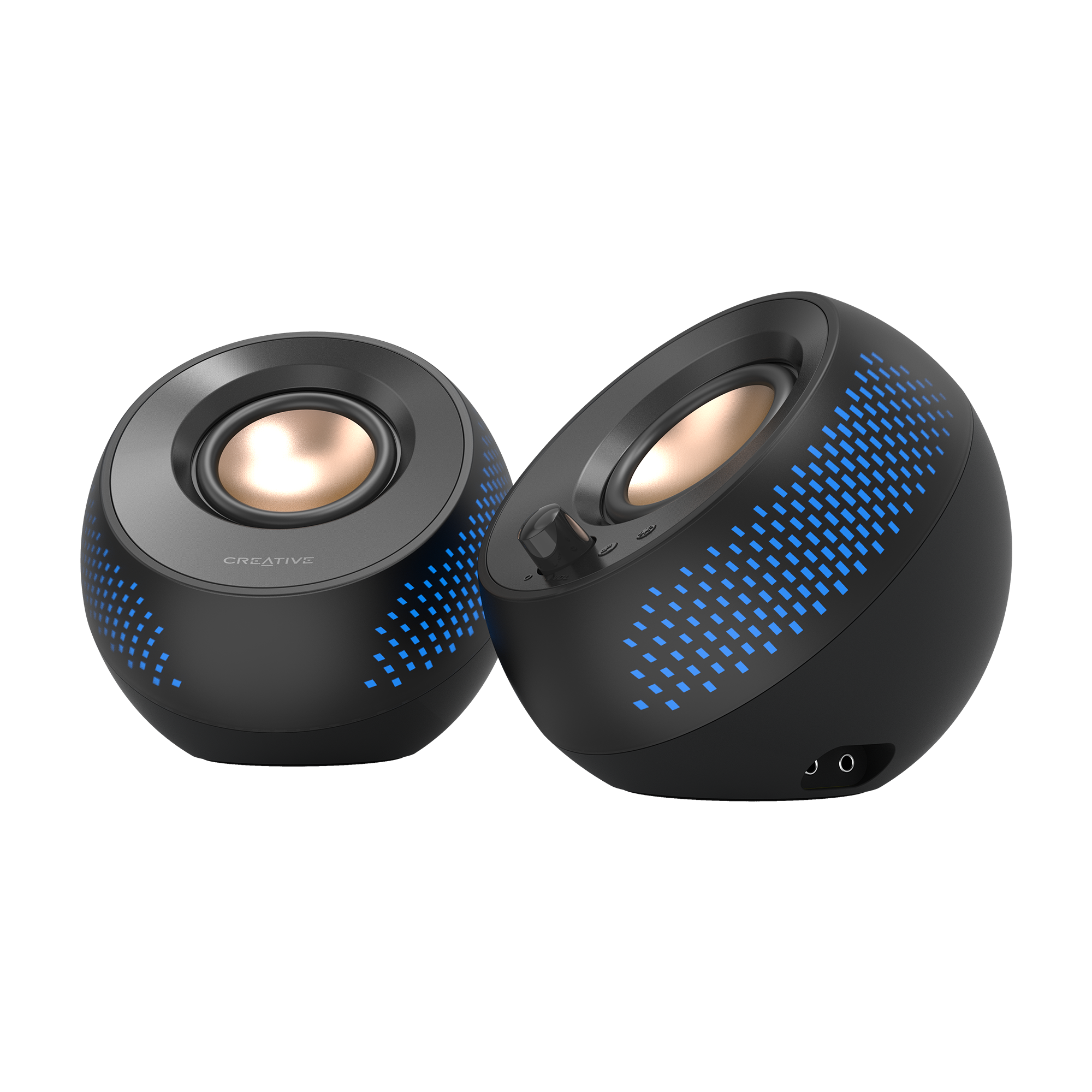 Creative Pebble X 采用简约的黑色立体设计,表面磨砂处理,可定制 RGB 灯光可让您增强任何的桌面设置,提升整体视觉吸引力。