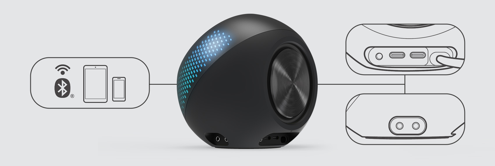 Creative Pebble X 提供 USB 音频播放、蓝牙® 5.3 串流和通用 3.5 毫米 AUX 输入端口的模拟连接。有线或无线模式,任您选择。