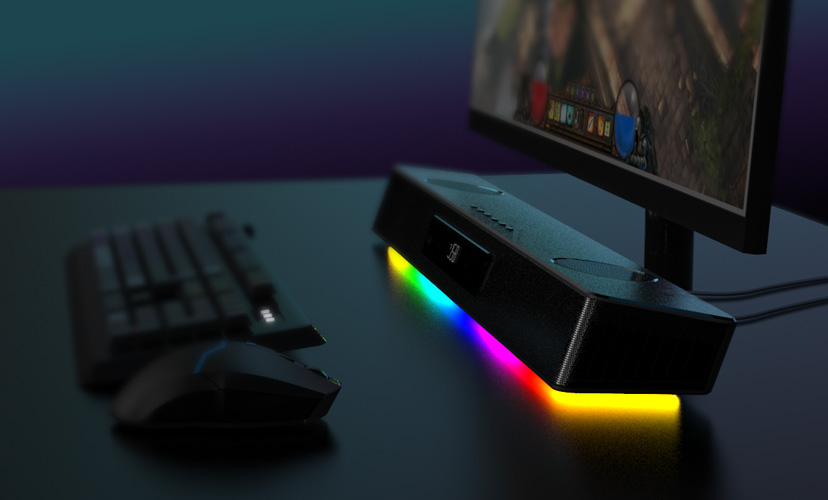 Sound Blaster Katana V2X 配有一个较小的低音炮,用于优化设计的音频系统,在不影响音频质量的情况下更大限度地减少占地面积。