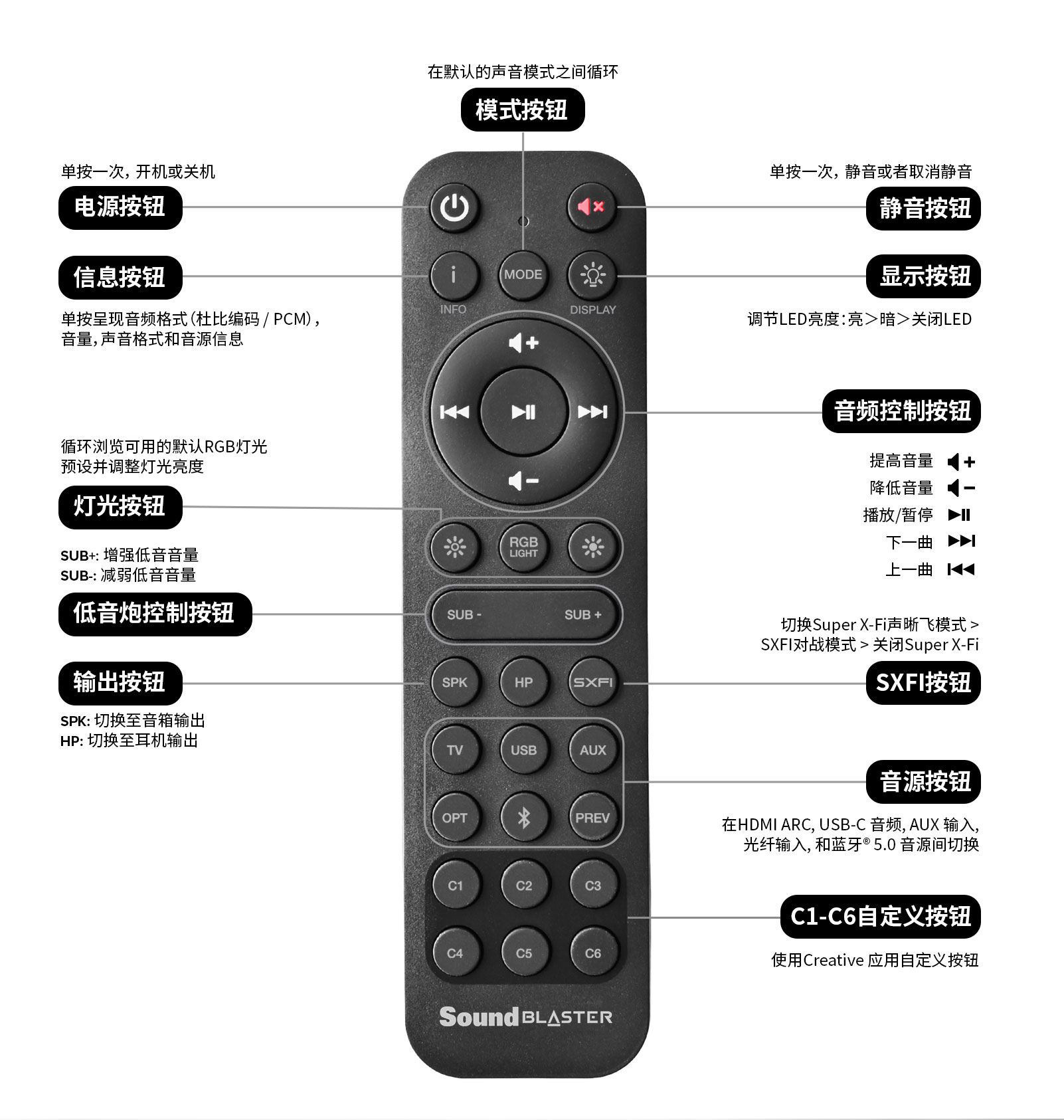 蓝牙 5.0, HDMI ARC, 光纤输入, AUX输入, USB-C, SXFI輸出