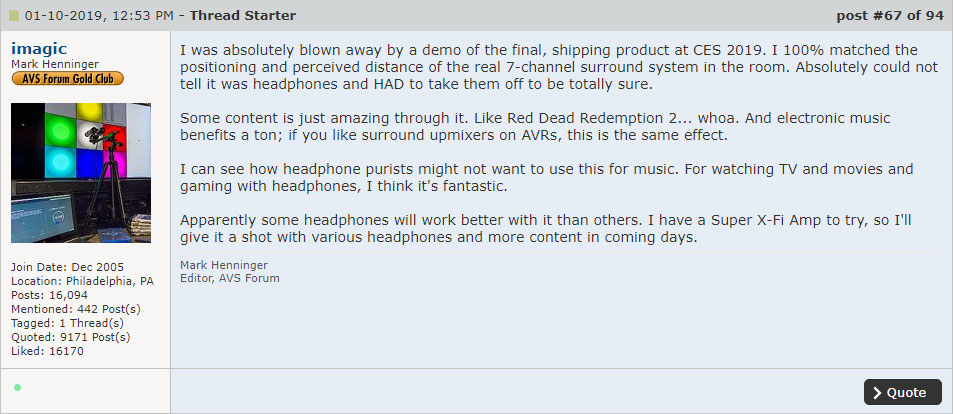Mark Henninger (Senior Editor, AVS Forum -- the world's largest AVenthusiast forum site) was so impressed with Super X-Fi that he awarded it Best of CES 2018 and 2019.